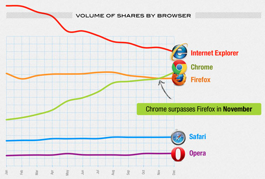 - Too many data points—Do we really need to show Firefox, Safari, and Opera? IE's precipitous decline and Chrome's meteoric rise are the real story. This is a brawl between the two dominant players in the space. Opera is a footnote in history and Firefox is only in the fight because of Fire Bug's dev tools. Strip the nobodies out and focus on the main event. Include Firefox, but only in that Chrome surpassed it.